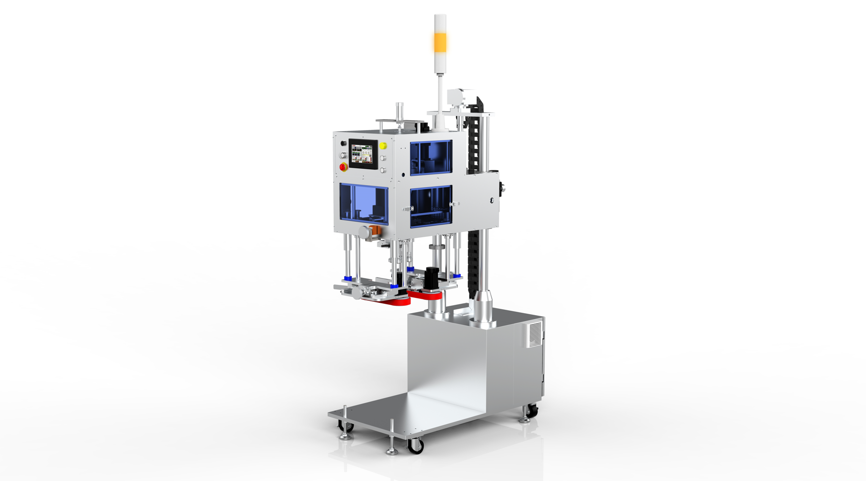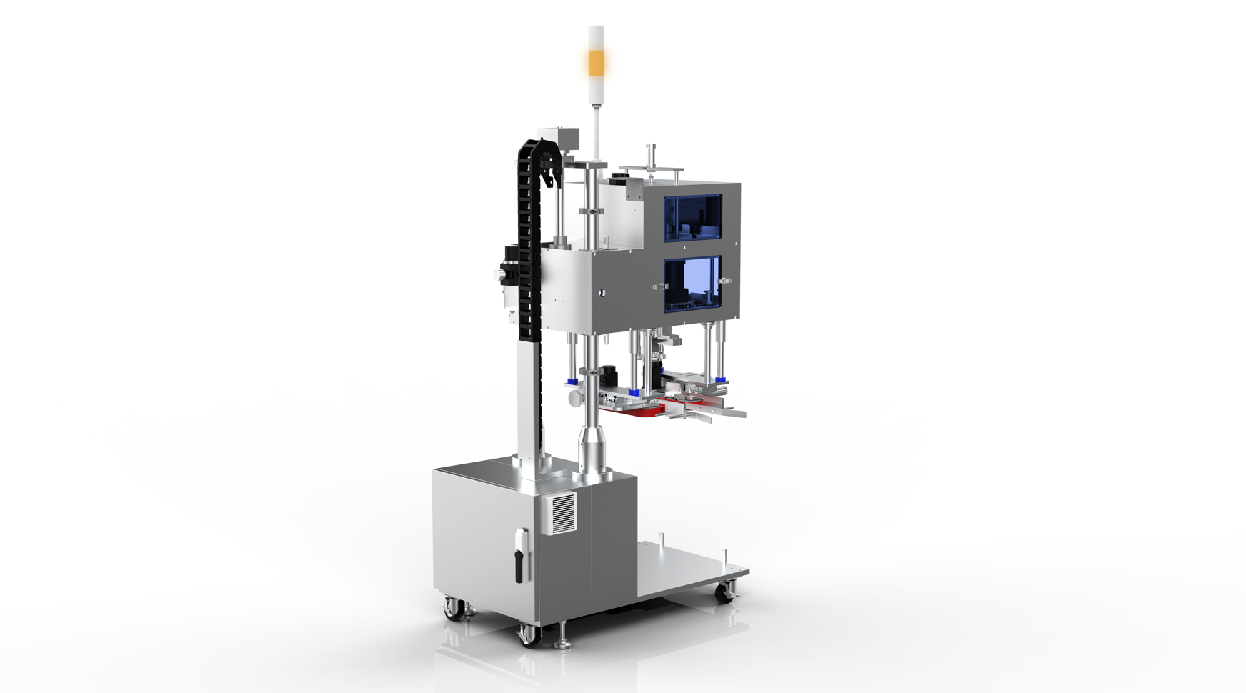 該機型用于手工包裝線輔助人工旋蓋,適用于能獨立站立輸送的產品,如水乳膏霜等廣口瓶包裝產品。人工將容器蓋預旋到容器上,進入該設備進行動力旋緊。設備采用獨立的伺服電機采用扭矩控制進行瓶蓋的旋緊,旋緊力度可以根據實際情況調節。設備整體可以自動升降,夾持帶可以相對設備整體單獨自動升降,所以可以適應不同流水線的高度和容器的高度。